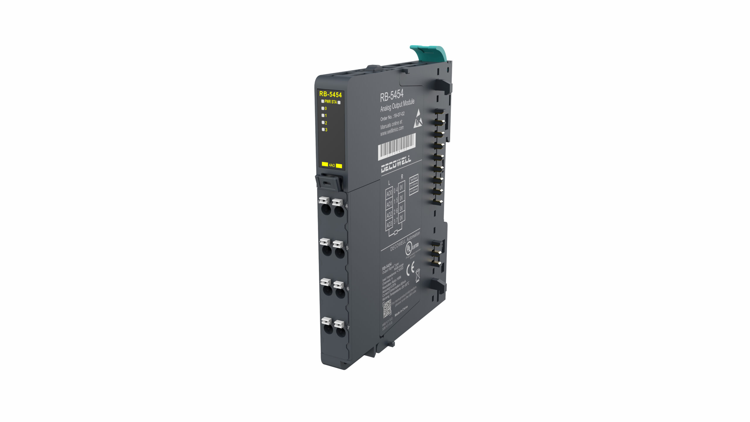 Projetado para integração em trilhos DIN com grau de proteção IP20, o RB-5454 assegura robustez e segurança operacional, além de conexões rápidas e confiáveis por meio de terminais push-in. Esta combinação de precisão, versatilidade e praticidade torna o módulo uma escolha eficiente para técnicos que buscam ampliar a capacidade de saída analógica de seus sistemas, mantendo alta confiabilidade e facilidade de manutenção.
